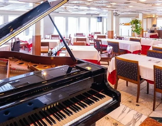 Inside, the ship is divided into several dining salons, each maintaining a classic, slightly nostalgic maritime elegance. One of the standout onboard amenities is the live music performance. Usually, a pianist or a small ensemble performs classical or jazz standards throughout the meal, which significantly enhances the atmosphere. For those looking for a romantic touch, the anniversary lunch package often includes a dedicated musical tribute or a small gift, making it a popular choice for couples.